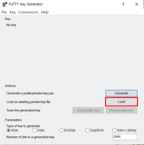 - PuTTYGen이라는 새로운 애플리케이션을 열어서 PPK 파일을 생성해야 한다.