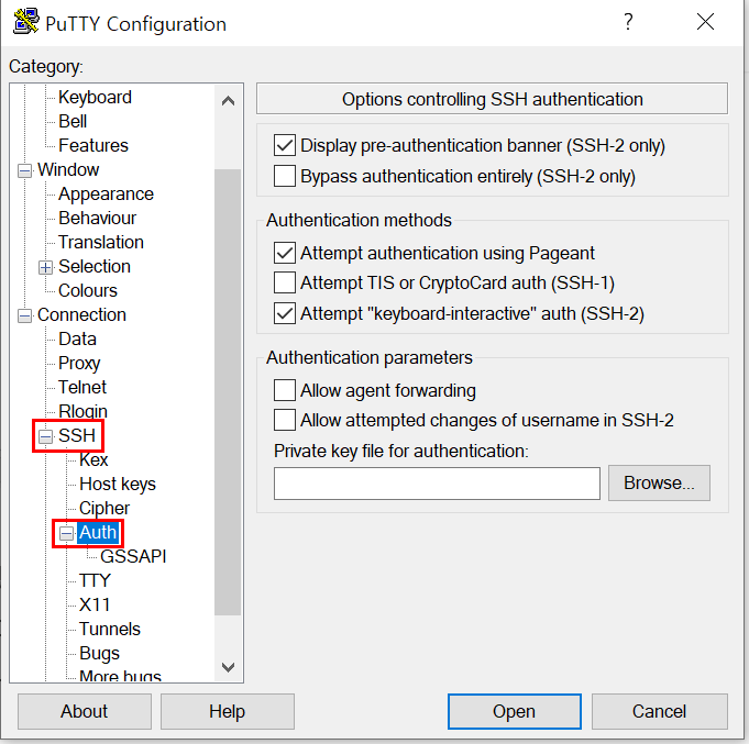 - 따라서 동일한 정보가 포함된 새로운 Session을 열고 SSH 및 인증을 선택한 다음 Auth 탭으로 들어간다.