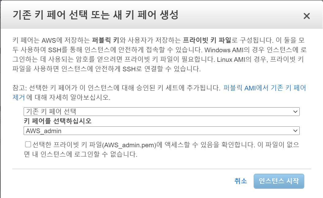 - New Key Pair 선택, 기존 Key Pair선택을 할 수 있다. - 해당 키는 SSH를 통한 연결에 절대적으로 필요하다.