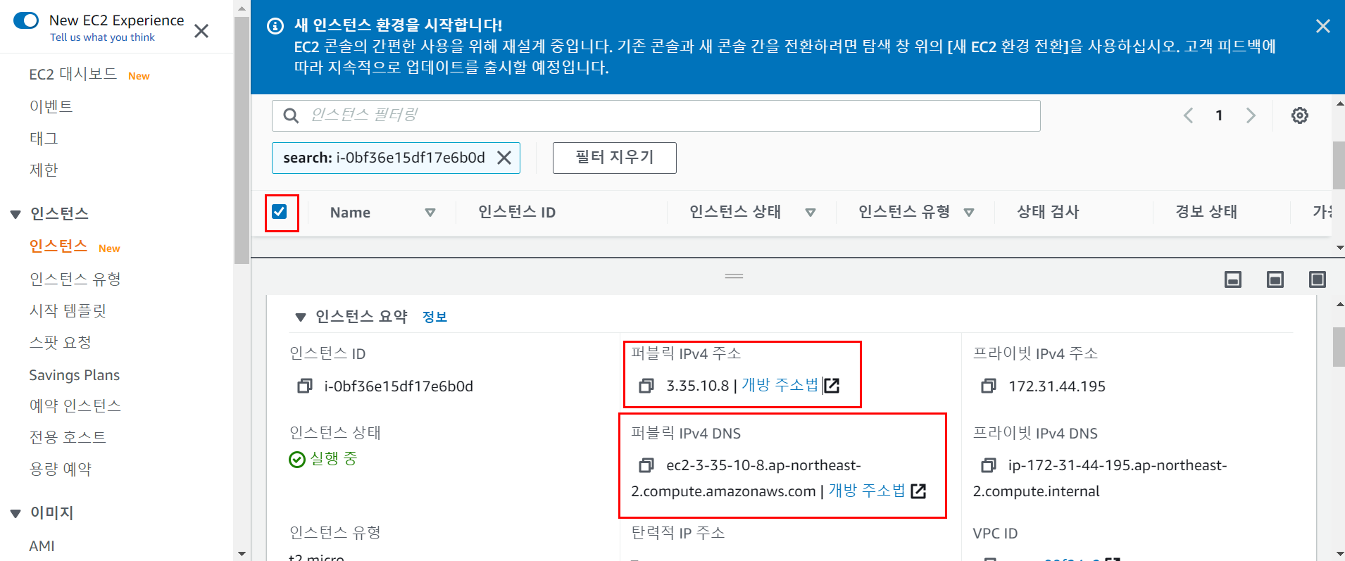 - 인스턴스 Check Box를 클릭하고 요약탭에 보면 인스턴스의 퍼블릭 DNS와 퍼블릭 IP주소를 확인할 수 있다.