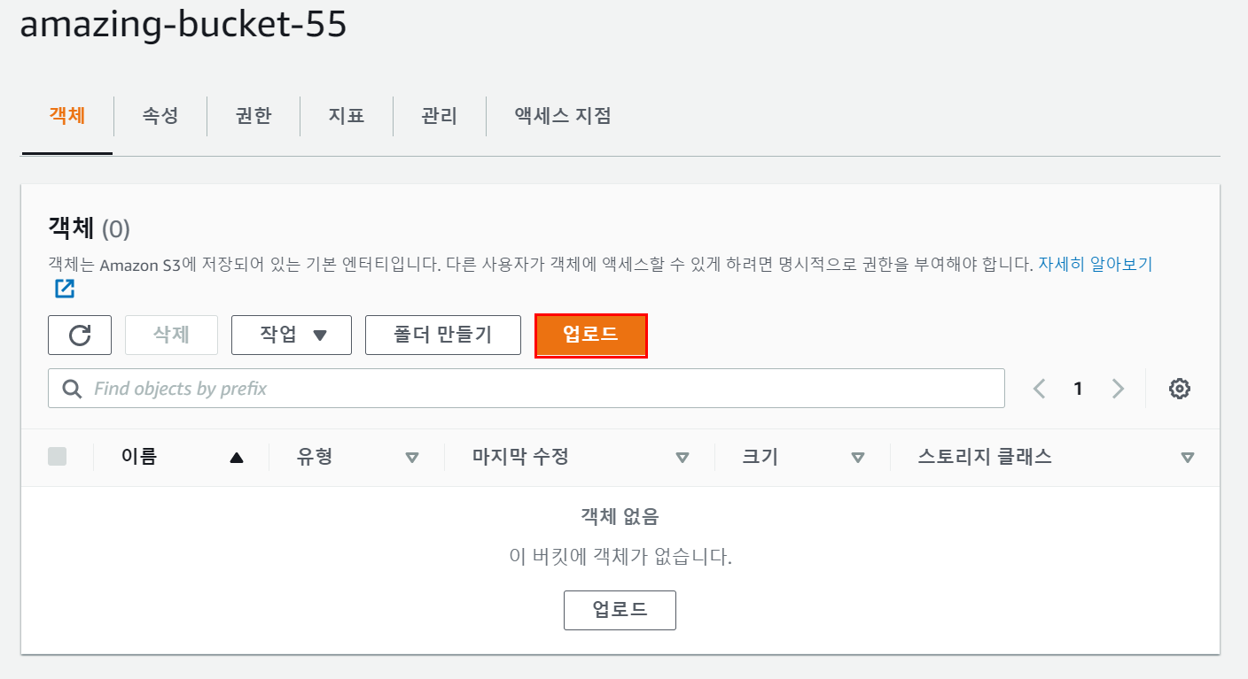 - 버킷을 클릭하면 버킷이 비어 있다는 메시지가 표시되고 새 객체를 업로드할 수 있다.
