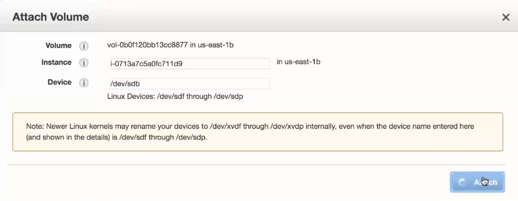 그 후 Attach Volume 버튼을 클릭하여 연결할 인스턴스를 지정할 수 있다.