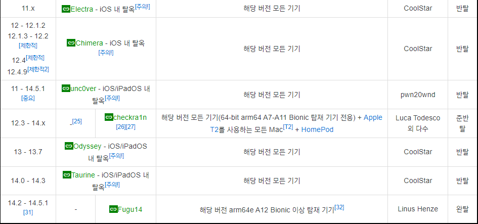 2021년 4월 초 iOS/iPadOS 14.0-14.3 Version 탈옥이 가능한 Taurine 툴이 출시되었다.